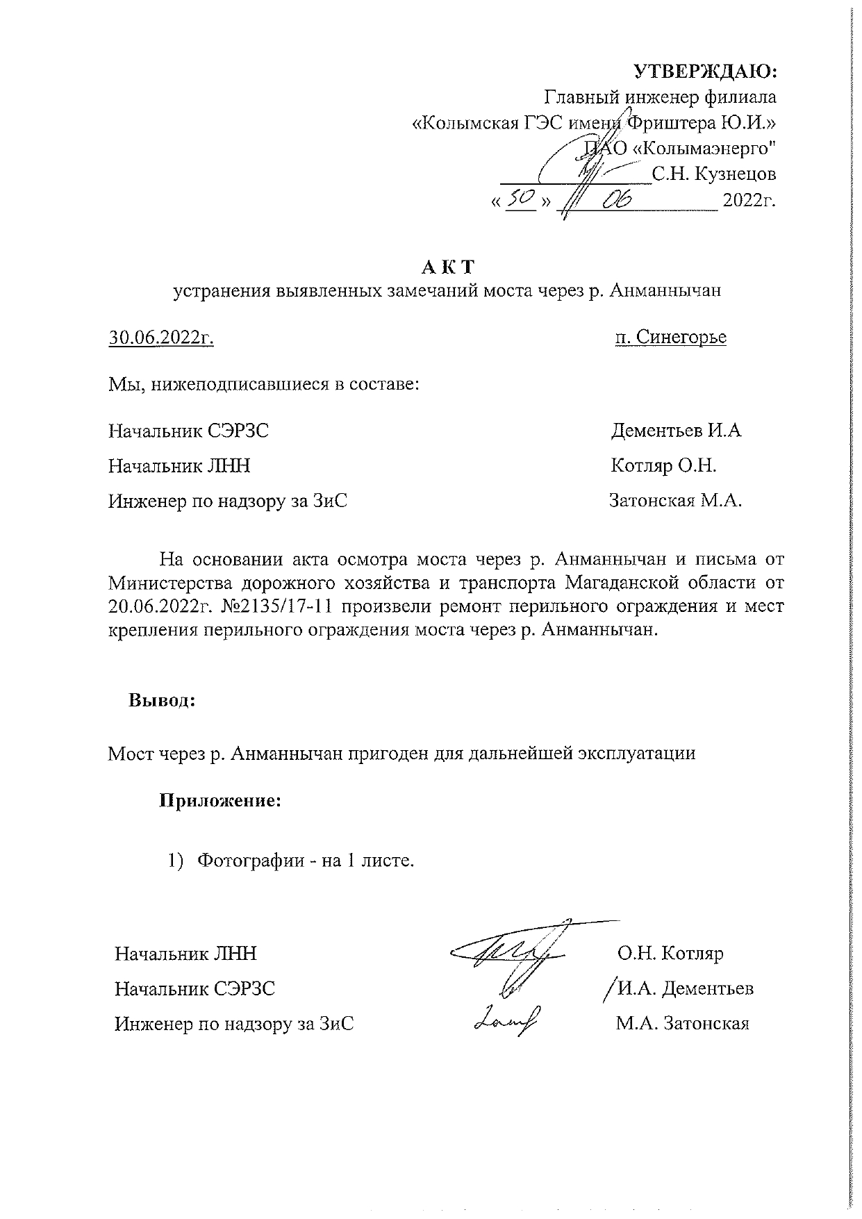 Плановый срок устранения 30 июня 2022 года". После получения этого ответа региональное отделение ЛДПР взяло работы на мосту на контроль. И вот письмом от 7 июля региональное министерство дорожного хозяйства уведомило, что работы выполнены, приложив акт и фотографию. В акте говорится о том, что ремонт произведён и делается вывод, что "мост через р. Анманычан пригоден для дальнейшей эксплуатации".